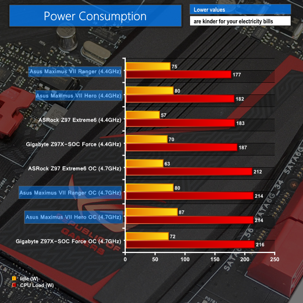 With a heavy set of features on each of the ROG motherboards, idle power consumption numbers are not impressive. When loaded though, the Maximus VII boards manage to show their relative efficiency at stock CPU speeds.