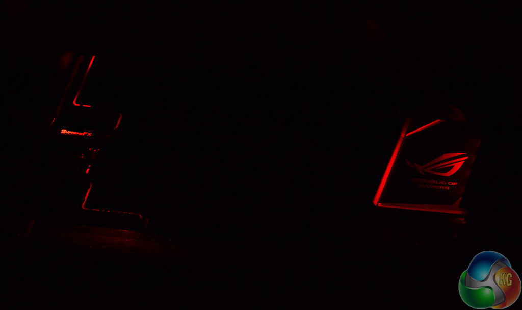 A heatpipe joins the VRM heatsinks to form a single unit, while the discrete chipset heatsink is also used to house eye-catching red LEDs. The red lighting theme also extends to Asus' SupremeFX audio system.