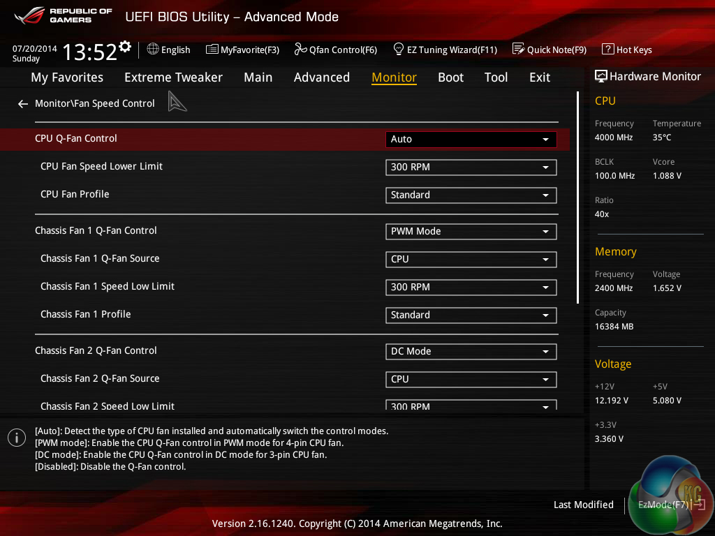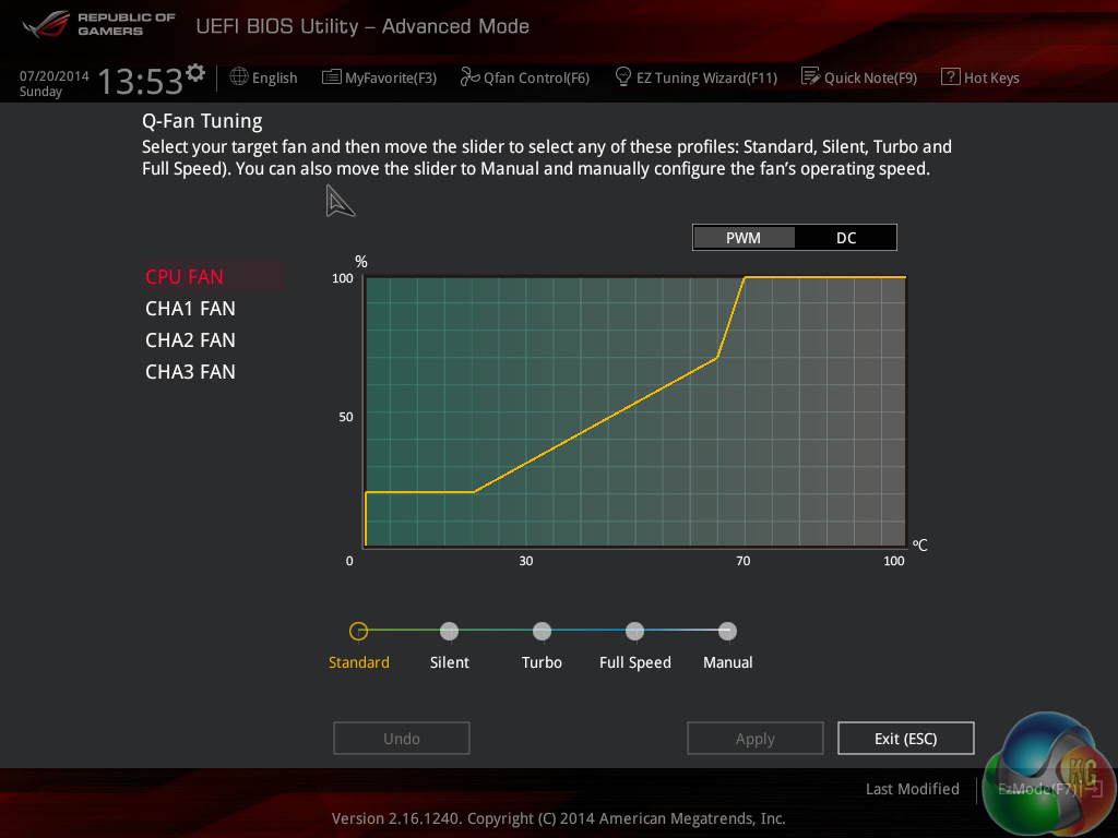 Asus gives the Z97 ROG UEFI its usual level of flexibility regarding fan speed tweaking. The Q-Fan Tuning utility gives users a graphical display from which they can adjust speed against temperature settings.