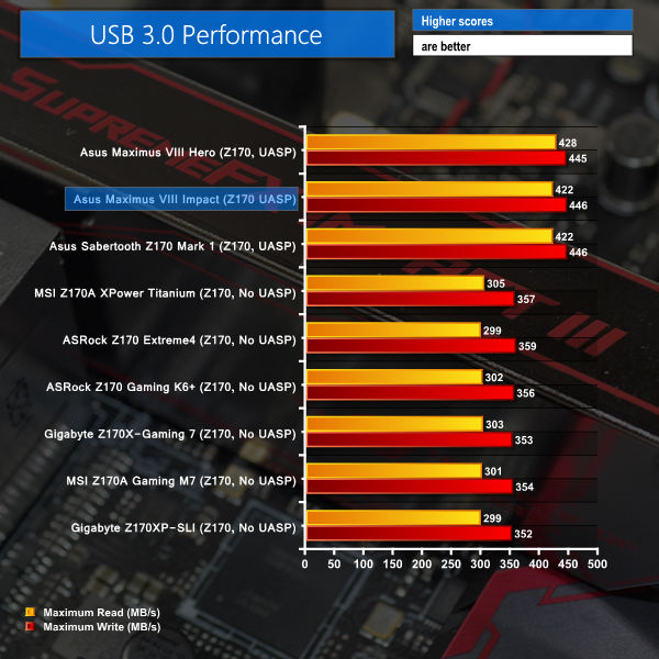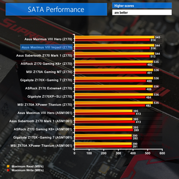 SATA 6Gbps performance from Asus' board is slightly faster than competing vendors' offerings. In the real world, this small transfer rate differential is unlikely to be noticeable, however it is undeniably present.