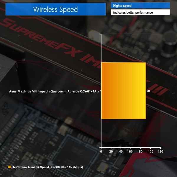 We use Totusoft’s LAN Speed Test software to measure the real-world throughput offered by the Asus Maximus VIII Impact motherboard’s WiFi solution. The test motherboard was located in close proximity to our Linksys EA6900 AC1900 802.11ac wireless router.