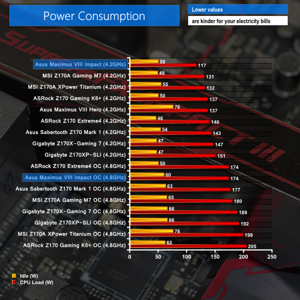 Asus' low voltage levels at stock (MCT) speeds deliver chart-leading power consumption numbers. Manual overclocking to a similar voltage level used by competing boards sees similar power being drawn from the socket.