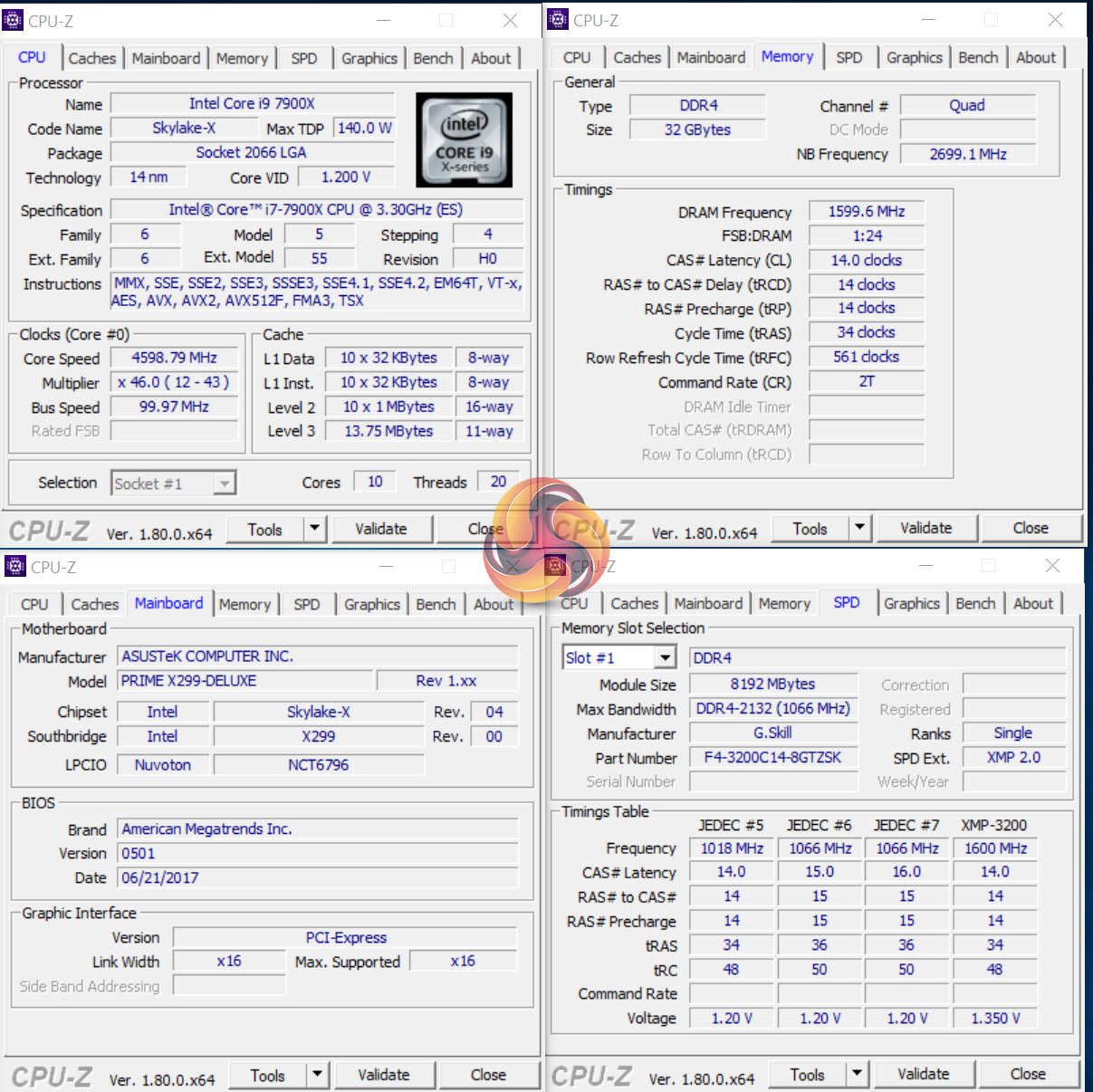 As a performance comparison, we have included the results from the Gigabyte X299 Aorus Gaming 3. The maximum overclocked configuration achieved with each board was a 4600MHz (46 x 100MHz) processor frequency whilst using 3200MHz CL14 memory.