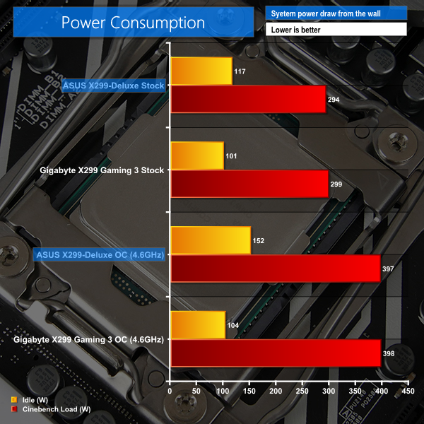 We leave the system to idle on the Windows 10 desktop for 5 minutes before taking a reading. For CPU load results we run Cinebench multi-core and take a reading. The power consumption of our entire test system (at the wall) is shown in the chart.
