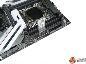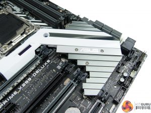 128GB of DDR4 can be installed alongside the LGA 2066 CPU. ASUS feeds the 8-phase CPU power delivery system with an 8-pin plus a 4-pin connector. This helps to allow the provision of more than 300W of continuous power when loading an overclocked high core count Skylake-X chip. Single 8-pin solutions may start to struggle when tasked with loading overclocked 12-18 core CPUs.
