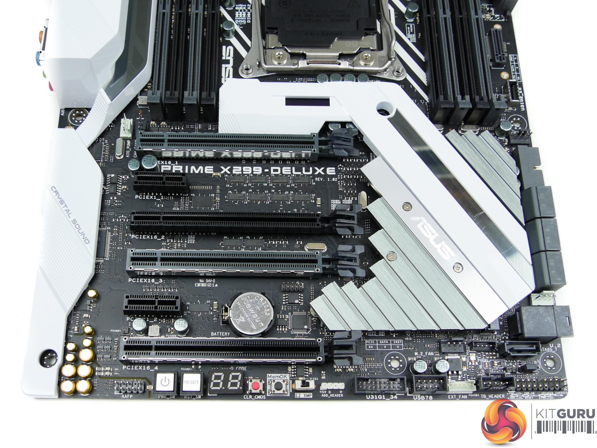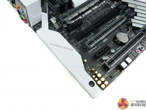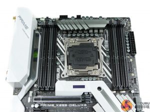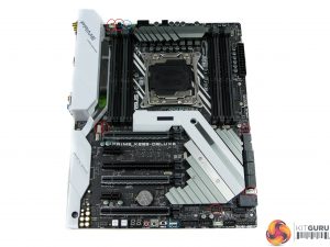 The ASUS Prime X299-Deluxe uses a primarily white, black, and grey colour scheme. Different shades of the three primary colours are spread across the ATX motherboard, with white seeing heavy uses on the rear IO and audio section cover.