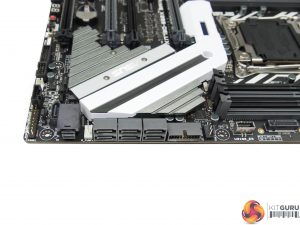 The board’s other X299-fed M.2 connector is accessed by removing a cooling plate connected to the chipset heatsink. This slot can take SSDs up to 80mm long and supports PCIe 3.0 x4 NVMe drives as well as SATA options. Intel Optane Memory is also supported.
