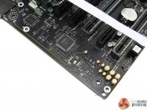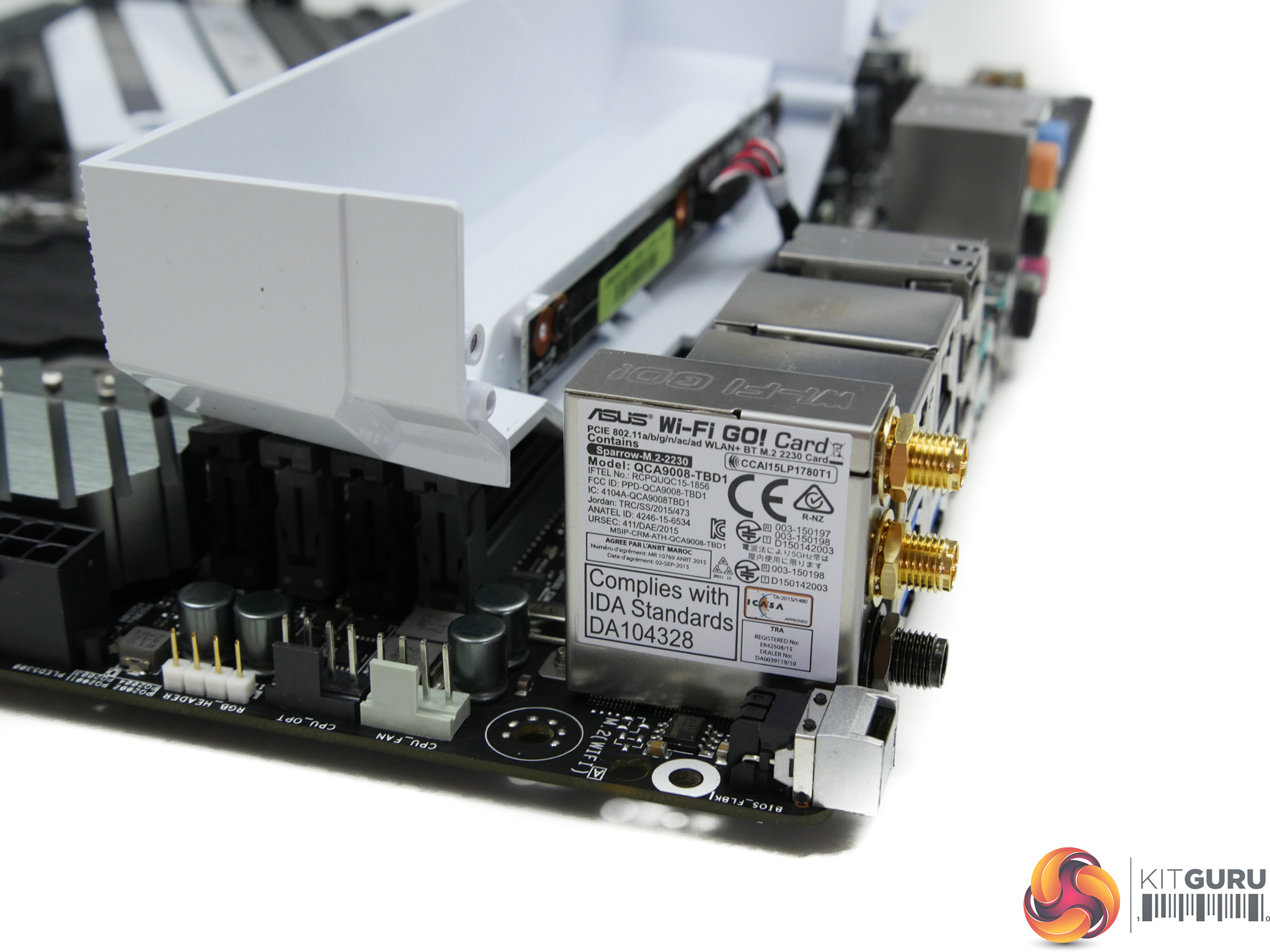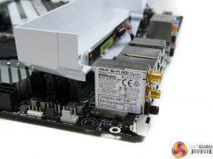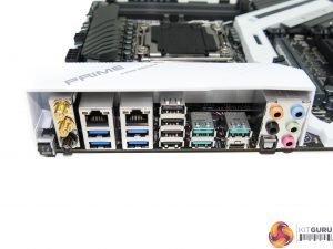 ASUS’ useful BIOS Flashback button is present and sits next to the three antenna points used for 802.11ac and 802.11ad WiFi connectivity. Dual GbE connections are provided by Intel I219V and I211AT NICs, both of which feature ASUS’ LANGuard ‘protection’.