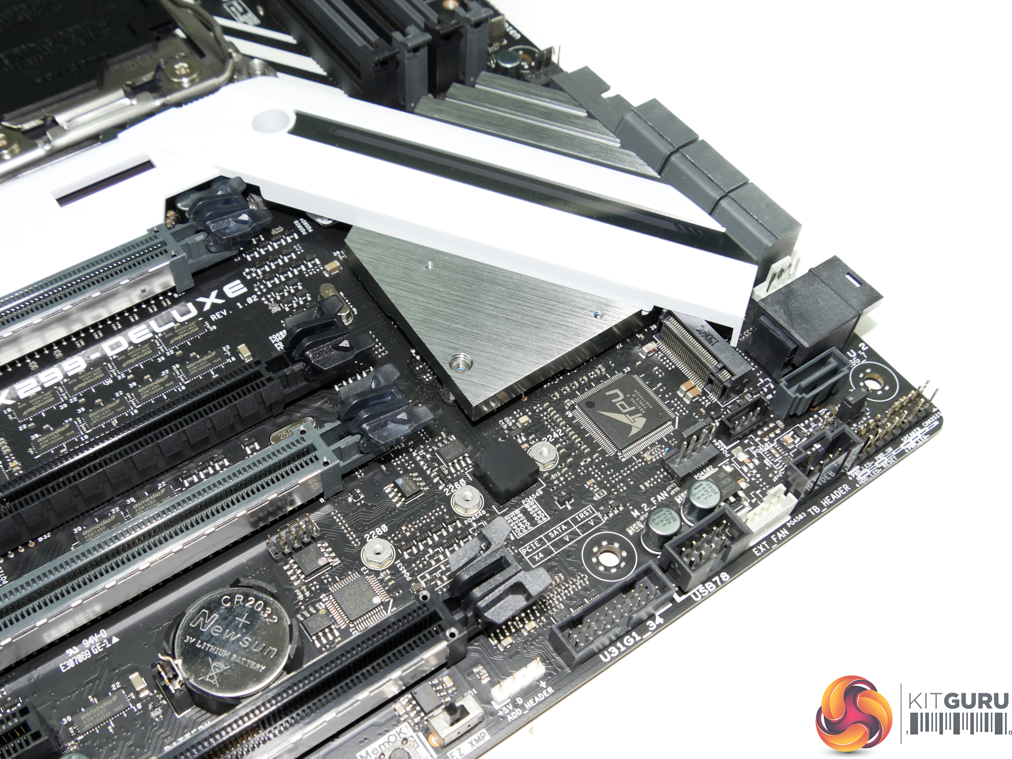 ASUS’ cooling design for this slot is smart; a block of metal contacts the SSD via a thermal pad and dumps that heat onto the large chipset heatsink. This gives the system significant thermal mass (with respect to the power output from an M.2 SSD) that can be used to absorb thermal energy removed from the SSD. The design should be significantly better at dealing with thermal throttling on M.2 SSDs than a bare drive that struggles to receive airflow.