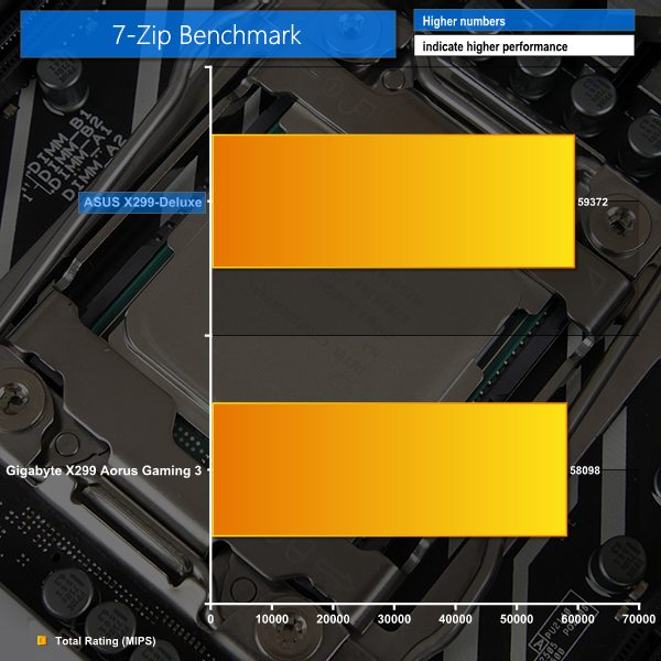 CPU-driven performance for ASUS' premium X299 board is strong. First place finishes are achieved in Cinebench and 7-Zip.