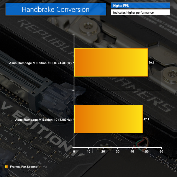To test the Asus Rampage V Edition 10 motherboard’s CPU overclocking potential, we first increased the CPU VCore to 1.325V, Cache voltage to 1.25V, and CPU Input Voltage to 2.0V. Load-line calibration (LLC) was set at level 5 as it seemed to best track the desired voltage under load.