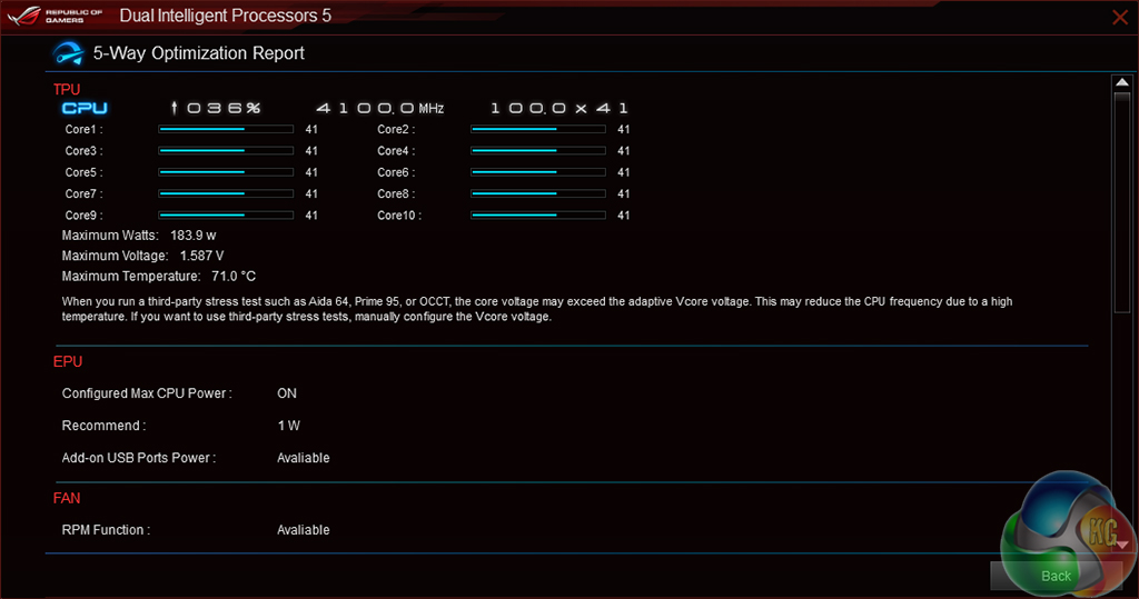 Asus gives users choice as to how they want their machine automatically overclocked. I tested out the software-based tuning mode which bumps the CPU speed up and stress tests the system to validate operation.