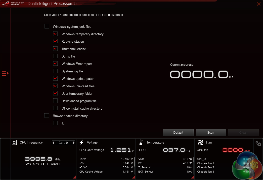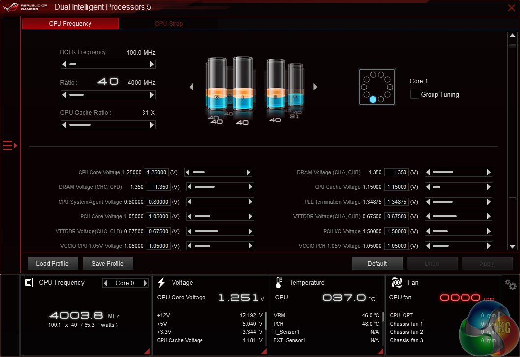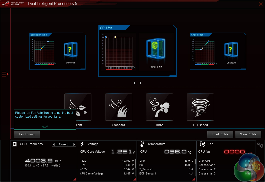 The Fan Xpert page gives a decent level of control to the system fans. Four pre-defined operating speed modes can be selected. There’s also an automated fan tuning option, in addition to the ability to load and save profiles.