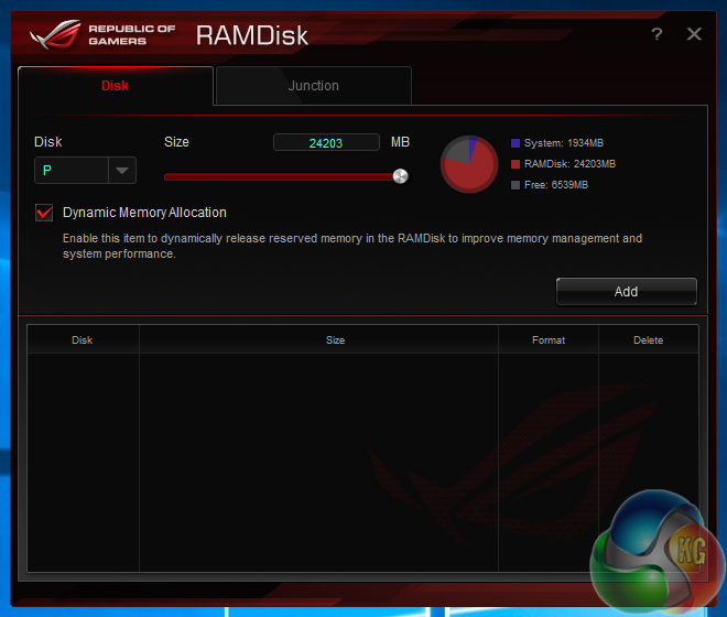 ROG RAMDisk creates a high-speed storage drive out of a user-definable allocation of system memory (up to approximately 24GB on our system which uses a 32GB memory kit). This could be useful to video editors who want a small pool of fast storage to act as a scratch disk for their project. Designers dealing with large CAD files may also benefit from the fast storage pool. However, game frame rates won’t be improved when using the RAM drive.