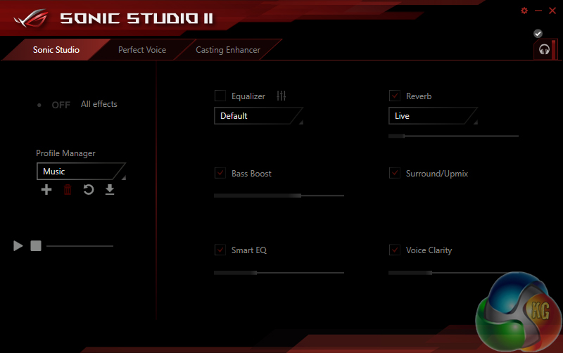 A number of settings and profiles relating to the audio system can be adjusted using Sonic Studio II and SupremeFX HiFi. The SupremeFX HiFi tool is also able to automatically detect the impedance of headphone connected to the external box and adjust the amplifier gain accordingly.