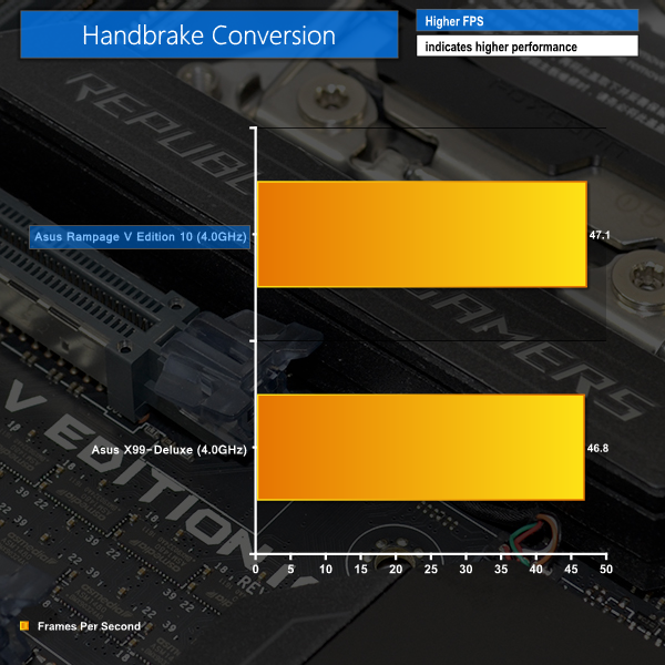Handbrake is a free and open-source video transcoding tool that can be used to convert video files between different codecs, formats and resolutions. We measured the average frame rate achieved for a task of converting a 1.72GB 1440P ShadowPlay game recording using the High Profile setting and MP4 container. The test stresses all CPU cores to 100% and shows an affinity for memory bandwidth.