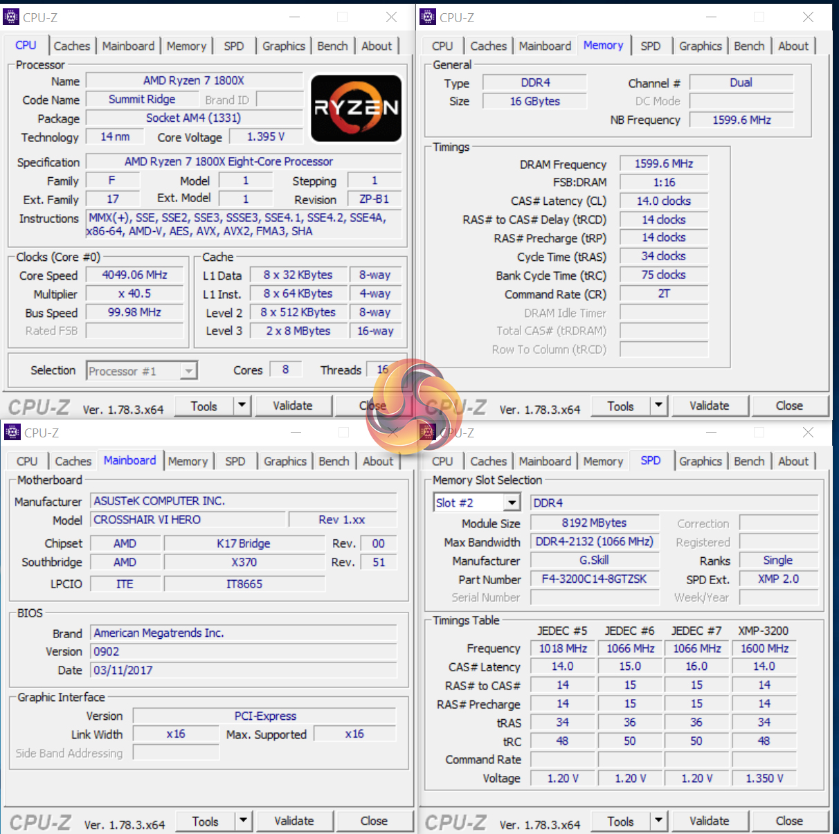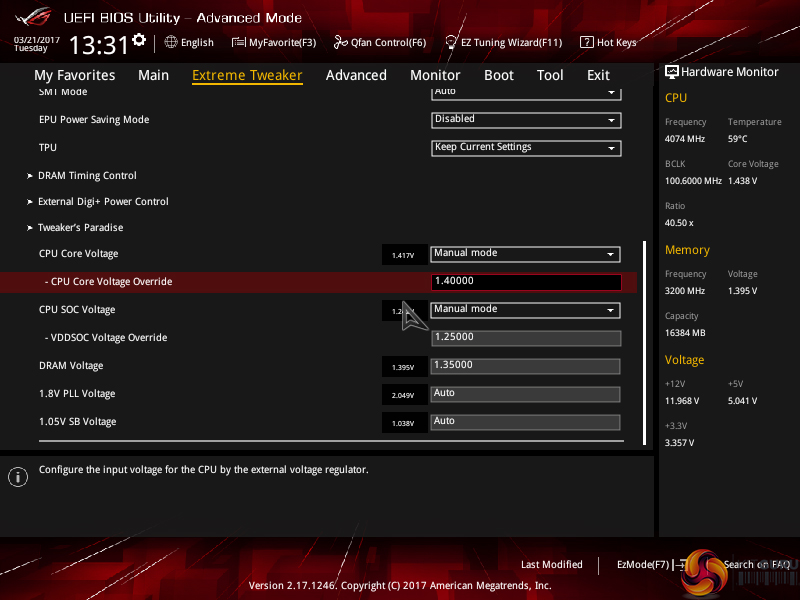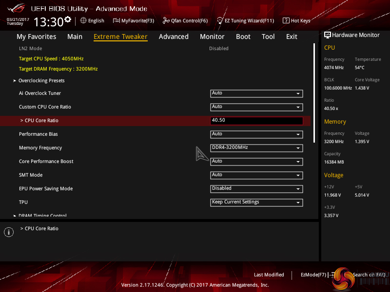 We were able to hit 4.05GHz using around 1.4V CPU VCore, which seems to be the highest level that our Ryzen 7 1800X likes to overclock to. Pushing up to 4.1GHz demands a large increase in voltage and the acceptance of flaky stability. 4.05GHz was Cinebench stable for five back-to-back runs with the ASUS Crosshair VI Hero.