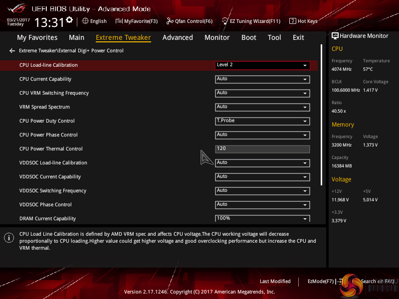 ASUS' logical UEFI layout aids the simplicity of overclocking. The primary settings that should be adjusted, such as the CPU ratio and VCore, are all displayed in the main Extreme Tweaker page. Loadline calibration settings are hidden in the External Digi+ Power Control subsection, probably because the settings provided by ASUS make little sense.