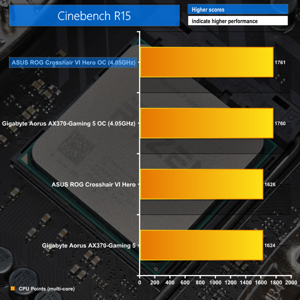 As a performance comparison, we have included the results from the Gigabyte Aorus AX370-Gaming 5 AM4 motherboard. The maximum overclocked configuration achieved with each board was a 4050MHz (40.5 x 100MHz) processor frequency whilst using 3200MHz CL14 memory.