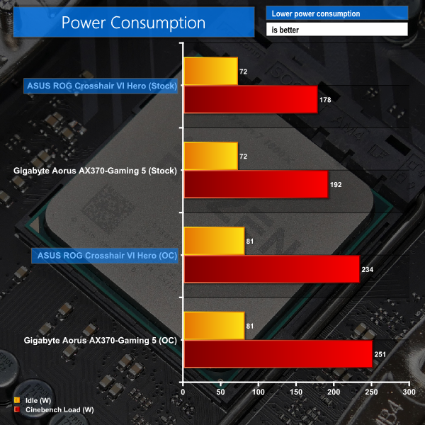 Power consumption for the Crosshair VI Hero was a strength compared to the Gigabyte AX370-Gaming 5. Idle power consumption figures are skewed by the efficiency curve of our 1000W PSU being limited at idle power draw levels. However, the loaded ASUS system draws a little less power than the Gigabyte competitor.
