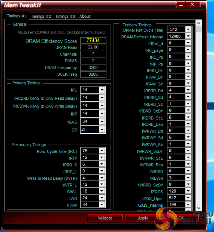 Mem TweakIT deals with information relating to DRAM frequency, timings, and a performance score.