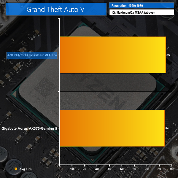 Gaming titles tend to be a little faster for ASUS' Crosshair VI Hero compared to Gigabyte's cheaper AX370-Gaming 5. GTA V rounds up to a higher average frame rate value while 3DMark Fire Strike scores nearly 500 points (around 2.5%) more on the ASUS motherboard.