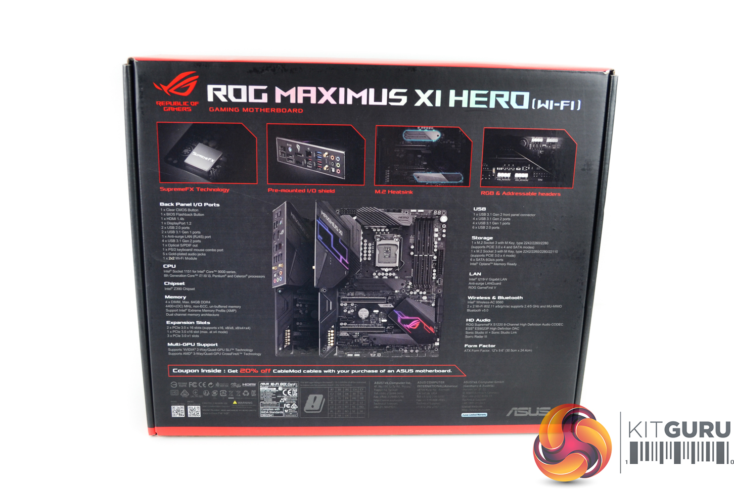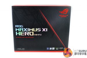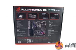 The ASUS ROG Maximus XI Hero (Wi-Fi) ships in a premium black and red box. Details and specifications are outlined on the rear.