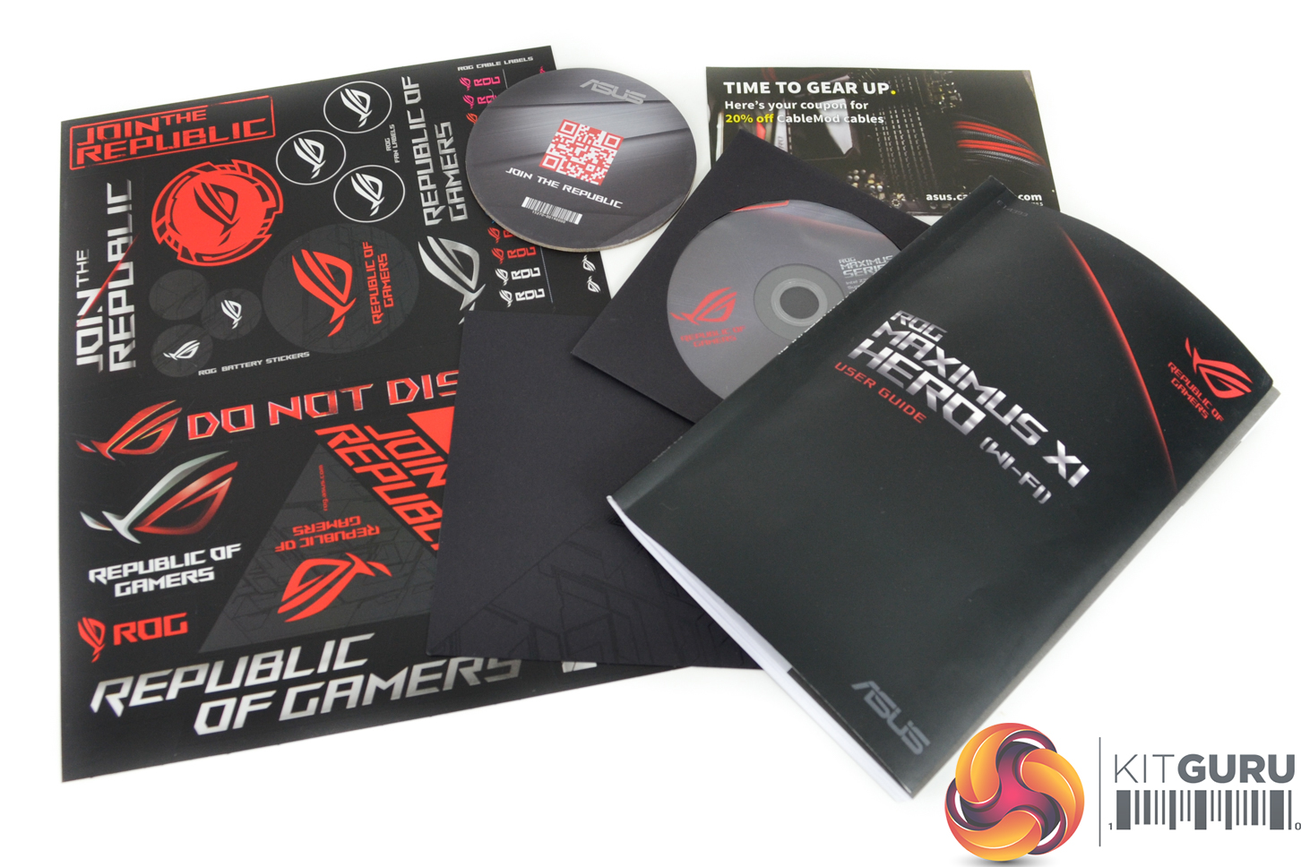 Alongside the instruction manual and driver CD, ASUS includes a variety of stickers (some of which are actually useful) and a discount for CableMod cables.