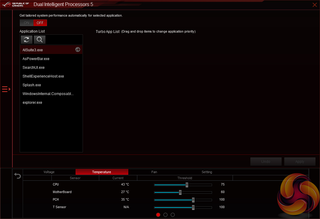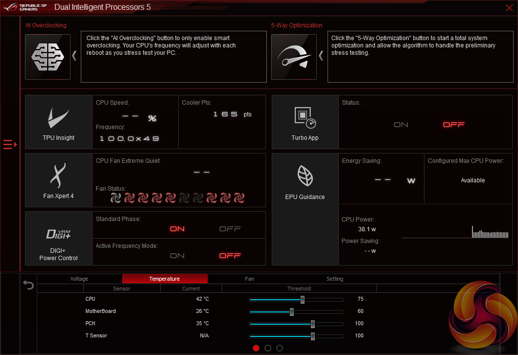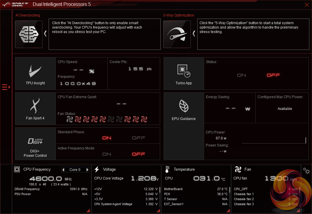 AI Suite 3 is the go-to point for any settings or information relating to system operations. Want to check temperatures and voltages or adjust multipliers for the CPU and speeds of fans? AI Suite 3. Want to speed up certain programs or reduce the amount of RAM-hogging operations on your system? AI Suite 3. Want to check for a BIOS update? AI Suite 3.