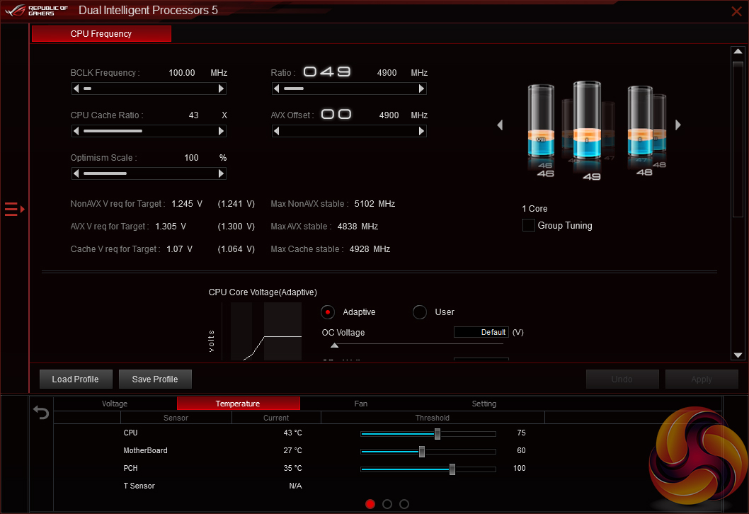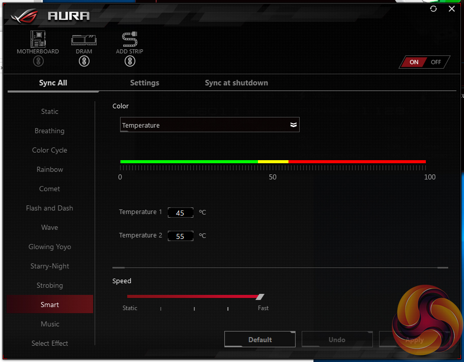 I particularly like the CPU temperature mode that changes the light colour based on processor thermals. The thresholds can be adjusted so that green stays present for longer or red is activated quicker. It was, however, noticeable how slow the LED colour would change when a load was applied. This is due to the lag in temperature readings through AI Suite 3 (the software tool that is used to drive AURA‘s temperature readings) and the hefty offset between it and third party tools such as HWiNFO64 and HWMonitor.