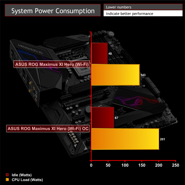 We leave the system to idle on the Windows 10 desktop for 10 minutes before taking a reading. For CPU load results we run AIDA64 CPU, FPU, and Cache stress tests and take a reading. The power consumption of our entire test system (at the wall) is shown in the chart.