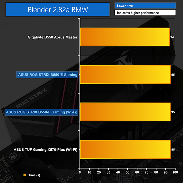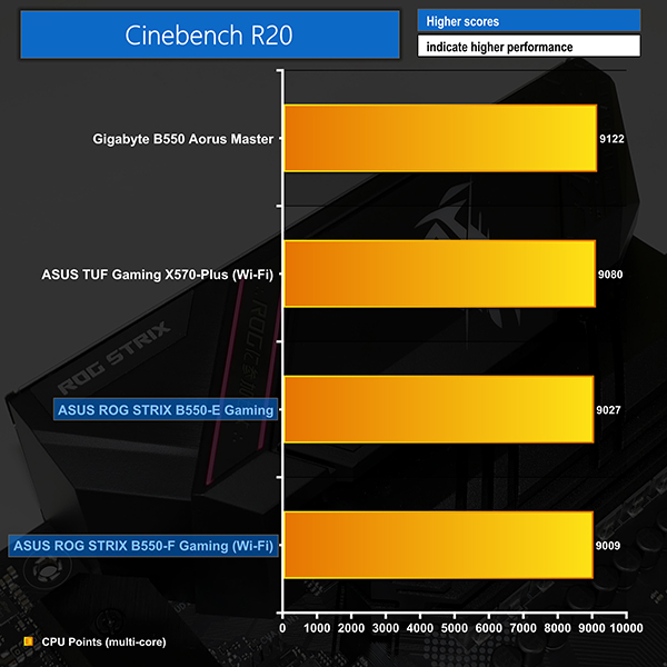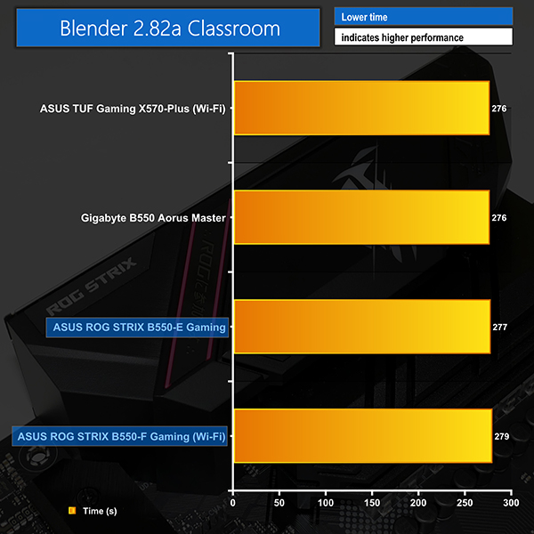It must, however, be noted that Gigabyte’s competing B550 Aorus Master was consistently equal or faster than ASUS’ options in the CPU-focused benchmarks. Gigabyte’s motherboard was better able to maintain slightly higher boost clocks with our Ryzen 9 3950X.