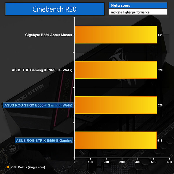 Starting off with CPU-based performance from the Ryzen 9 3950X, we see both of ASUS’ B550 options putting in solid performance numbers. Multi-threaded scoring is comparable or within touching distance of competing B550 and X570 options. And we see reasonable single-threaded scores from Cinebench R20.