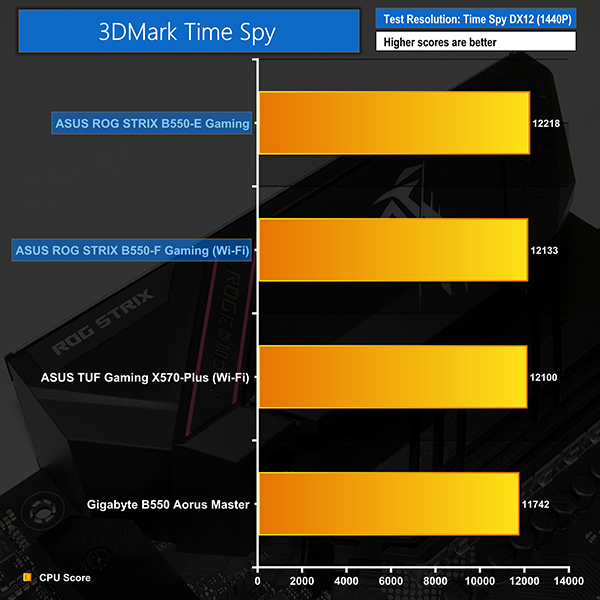 Aided by their full PCIe x16 connection to the graphics card, unlike the x8 link for Gigabyte’s B550 Aorus Master, the ASUS B550 options take comfortable victories in 3DMark scoring.