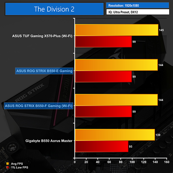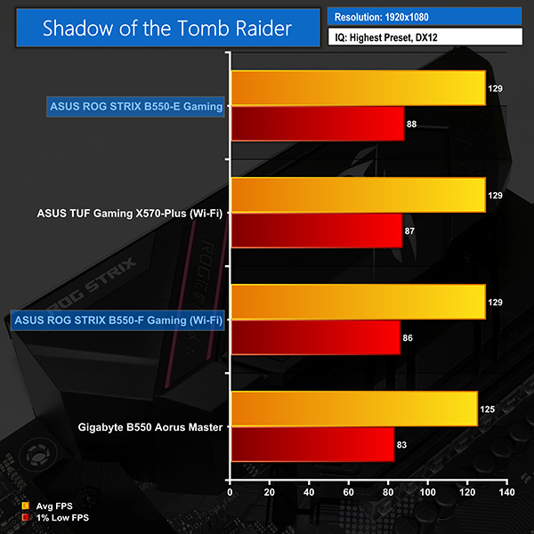 Both of the ROG STRIX options continue to outperform Gigabyte’s alternative when looking at gaming frame rates. The performance from the B550 boards is basically identical to that of ASUS X570 competitor.