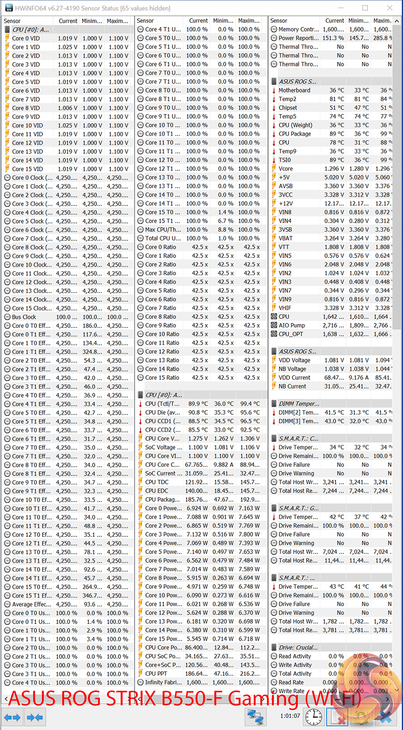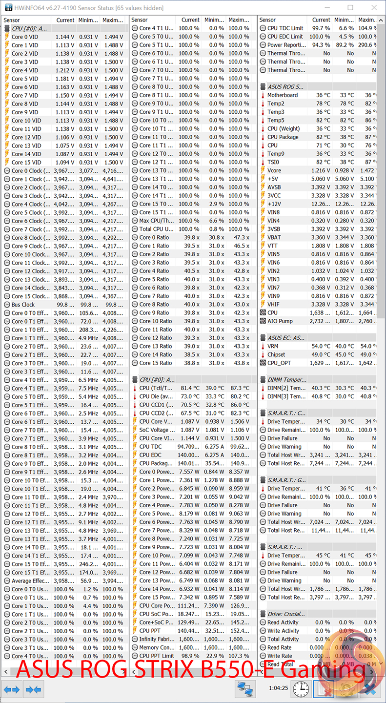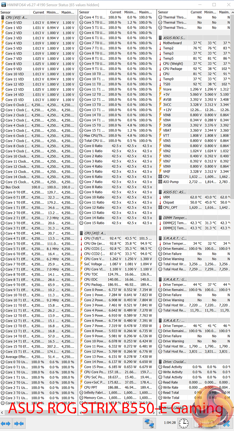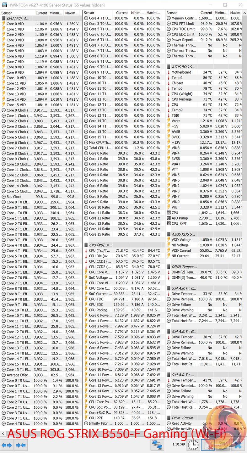 According to HWiNFO64, the B550-F Gaming (WiFi) delivered 1.27V under load and the B550-E Gaming delivered 1.26V. This is an accuracy level that we were happy with, especially given the trial and error LLC approach.