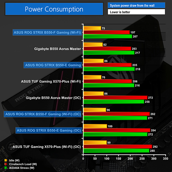 We leave the system to idle on the Windows 10 desktop for 10 minutes before taking a reading. For CPU load results we run AIDA64 CPU, FPU, and Cache stress tests and take a reading. The power consumption of our entire test system (at the wall) is shown in the chart.