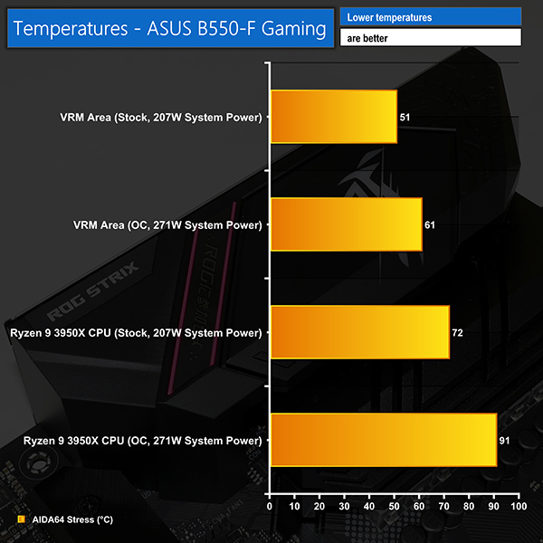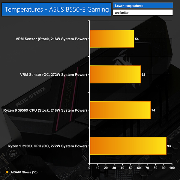 Sensible voltages helped the B550-E Gaming run at reasonable temperatures for the CPU and VRM.