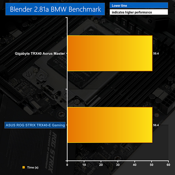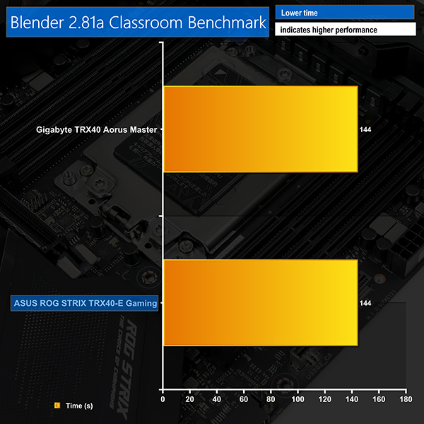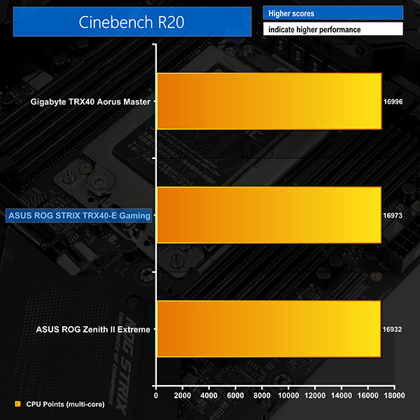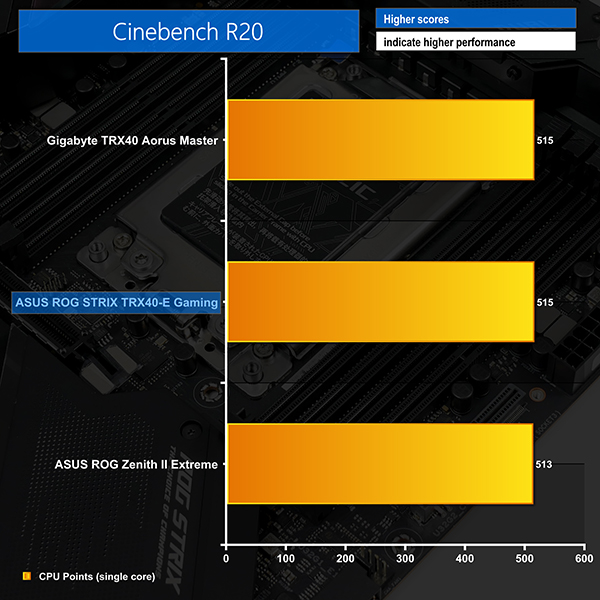 As expected, performance between the competing boards is very similar in Cinebench. Gigabyte’s price competitor pips the ASUS TRX40-E Gaming to top spot in the multi-core test, but the differences between all solutions here are unnoticeable in real world usage. All-core frequency for the ASUS board was around 3850MHz (38.5x) to 3875MHz (38.75x) during Cinebench loading.