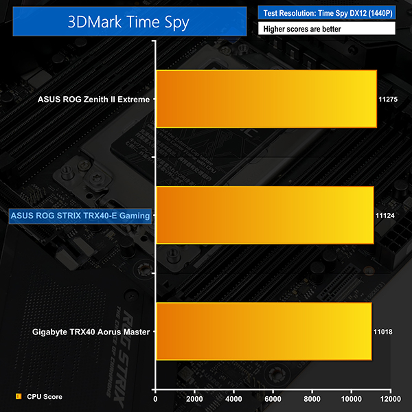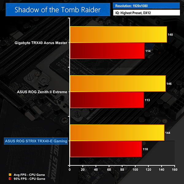 Similarities in boost clock behaviour means that performance in game-related benchmarks is similar for all options. ASUS’ ROG STRIX TRX40-E Gaming does pull out a small victory over its Gigabyte competitor in 3DMark Time Spy. However, the ASUS board is a few FPS slower on average in our Shadow of the Tomb Raider testing.