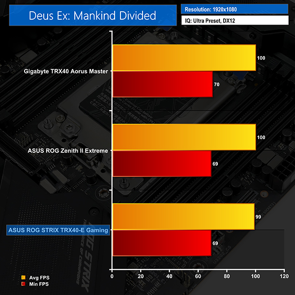 Despite its age, Deus Ex: Mankind Divided remains a demanding title even for modern hardware. We use the game’s built-in benchmark with quality set to Ultra, MSAA disabled, and DX12 mode.