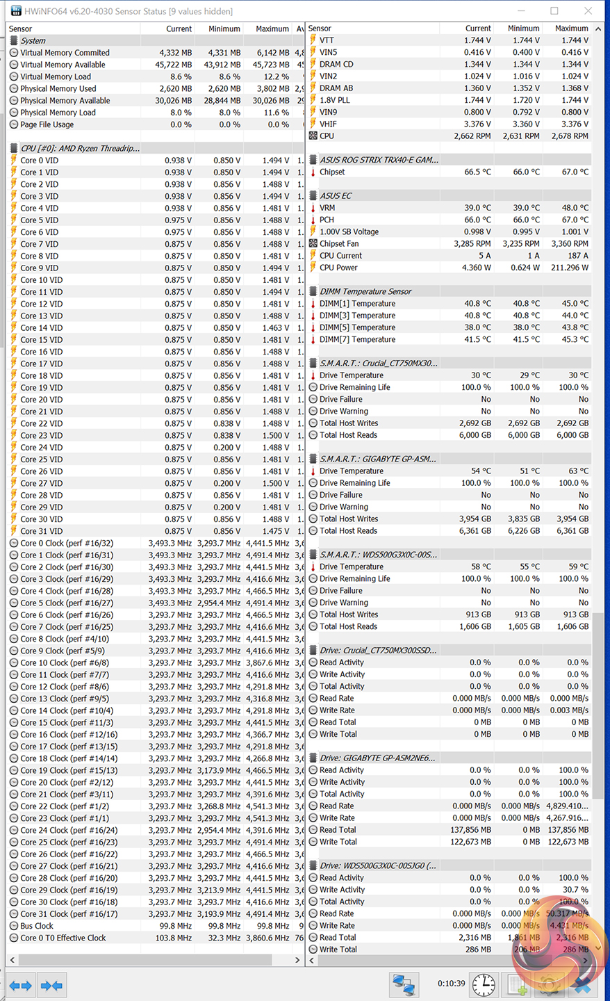 Cooling performance from ASUS’ heatsink was perfectly good, with our logs showing a peak temperature of 63°C for the CrystalDiskMark test run. That’s a similar level to what we have seen from competing motherboards, so short, bursty SSD loading does not seem to be hampered by ASUS’ cooling plate design.