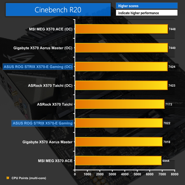 With ASUS’ motherboard overclocking the Ryzen 9 3900X to 4.25GHz, Cinebench R20 multi-threaded performance increased by 402 points. That’s a solid 5.7% gain that’s pretty reasonable if your workloads are primarily multi-threaded.