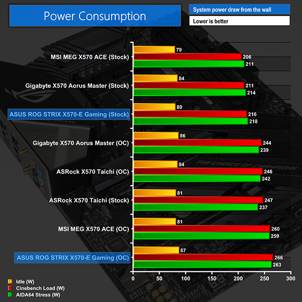 ASUS applies sensible voltage levels to our Ryzen 9 3900X under stock conditions and therefore the power readings from the wall are reasonable. 216-218W under load is just a smidgen higher than the power draw from the MSI and Gigabyte competitors and is significantly lower than ASRock’s over-volted X570 Taichi. Bear in mind that ASUS had our Ryzen 9 3900X operating at an average of 4017MHz all-core frequency with the latest AGESA ABBA BIOS revision.