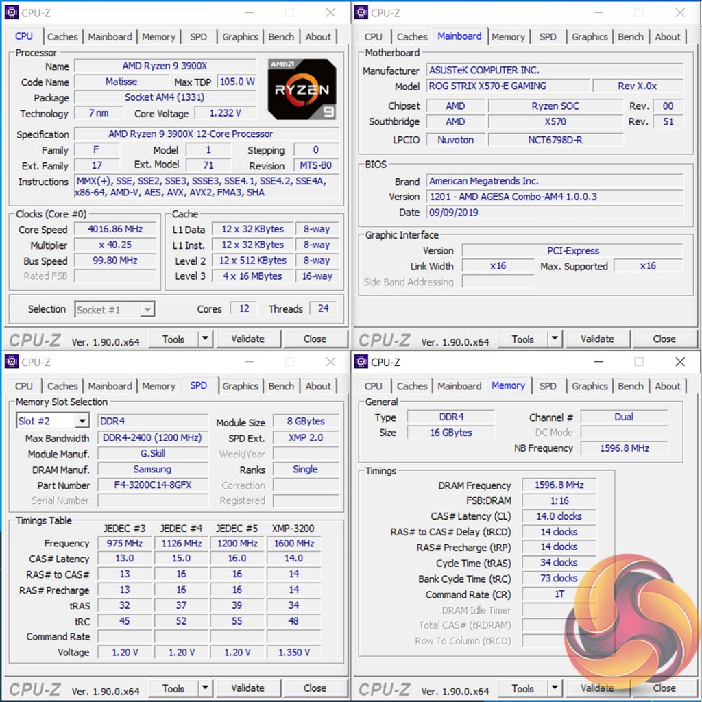 - ASUS ROG STRX X570-E Gaming UEFI 1201 AGESA 1.0.0.3ABBA (latest at the time of testing).