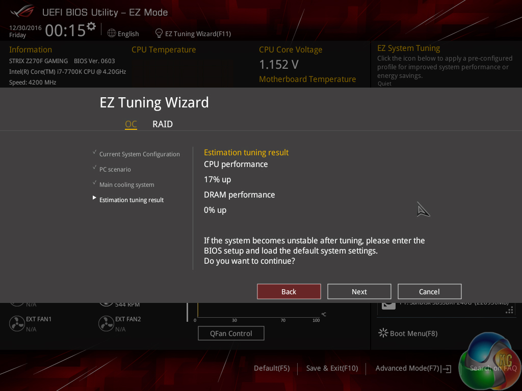 The EZ Tuning Wizard works well but the applied settings are certainly a touch on the aggressive side and could introduce system instability through the CPU or memory frequencies.