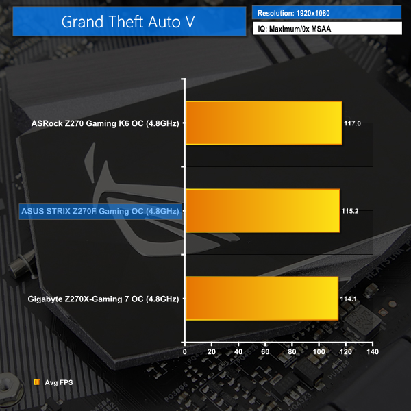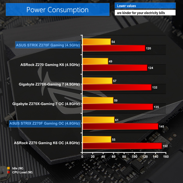 Power consumption from the ASUS board is good when the CPU is clocked at stock (forced turbo) speeds. A conservative ~1.22V VCore is to thank for such impressive power draw numbers. When overclocked, the ASUS STRIX Z270F Gaming continues to show its efficiency.