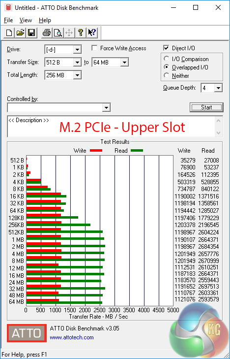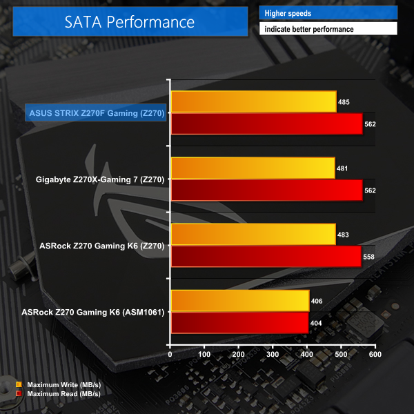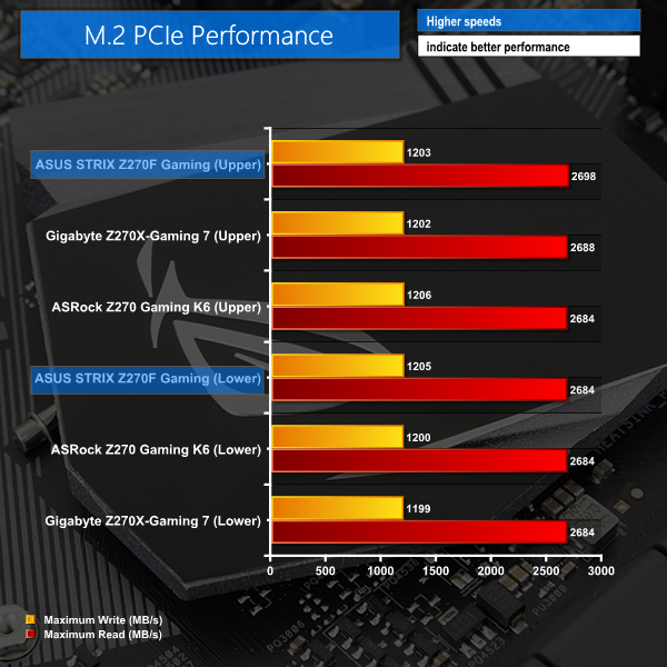M.2 transfer rates are strong and should not bottleneck a PCIe 3.0 x4 SSD such as our Toshiba OCZ RD400. ASUS does not give any provision for M.2 SSD cooling and this will cause issues during heavy sustained write operations on SSDs susceptible to thermal throttling, such as Samsung's 950 Pro.