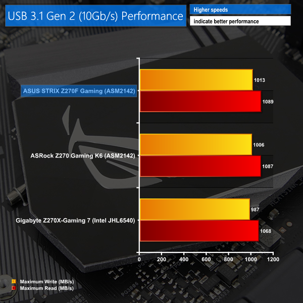 10Gbps USB 3.1 Gen 2 performance is strong. The ASUS board pushed past 1GBps read and write using our RAID 0 SSD test solution.