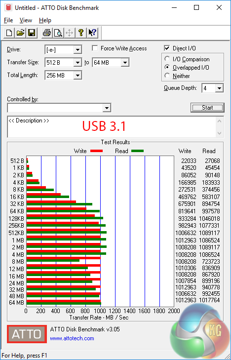 We test USB 3.1 performance using a pair of Corsair Force LE 120GB SSDs in RAID 0 connected to an Icy Box RD2253-U31 2-bay USB 3.1 enclosure powered by an ASMedia ASM1352R controller.